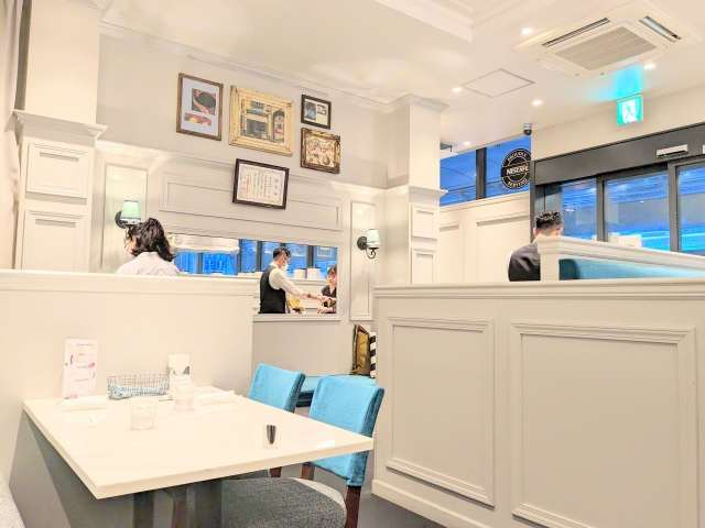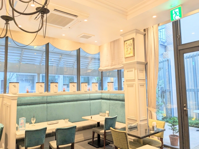 店内は、白い壁にグリーンの椅子が並ぶおしゃれでかわいらしい雰囲気。大理石風なテーブル、シャンデリア風の照明、カーテンや絵画がゴージャスな雰囲気を演出します。