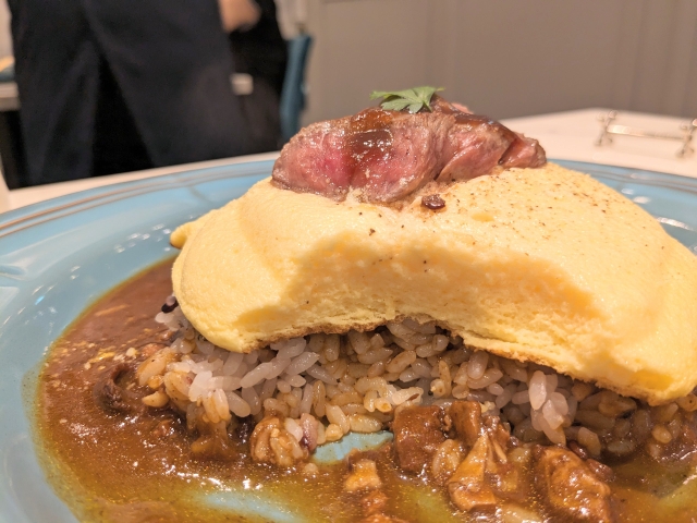 せっかくならスフレオムライスは食べてみたい!ということで、おすすめの『スフレオムライス極上赤味ステーキのせ(税込3,630円)』にしてみました。
