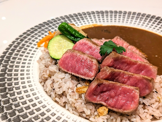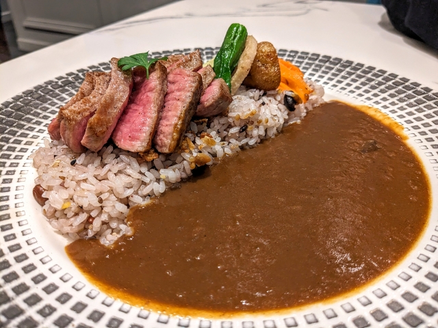 カレーがさっぱりとしているため、ステーキとの食べ合わせもばっちり。野菜も良いアクセントになり、くどさを感じず最後まで美味しく食べることができるメニューでした。