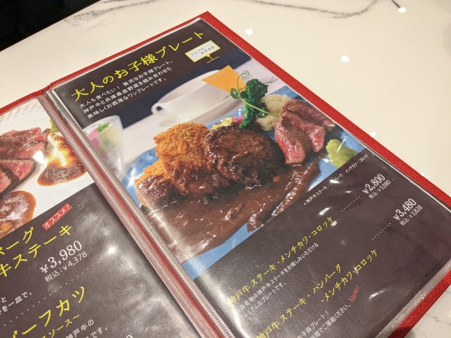 気になるのは「大人のお子様プレート」。神戸牛ステーキ、メンチカツ、コロッケが乗ったワンプレートメニュー。なんだかわくわくします。
