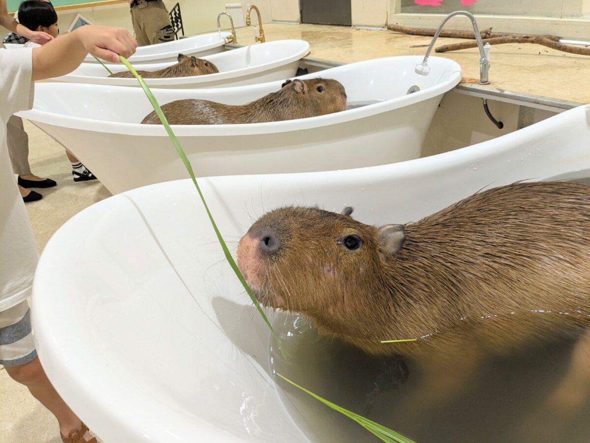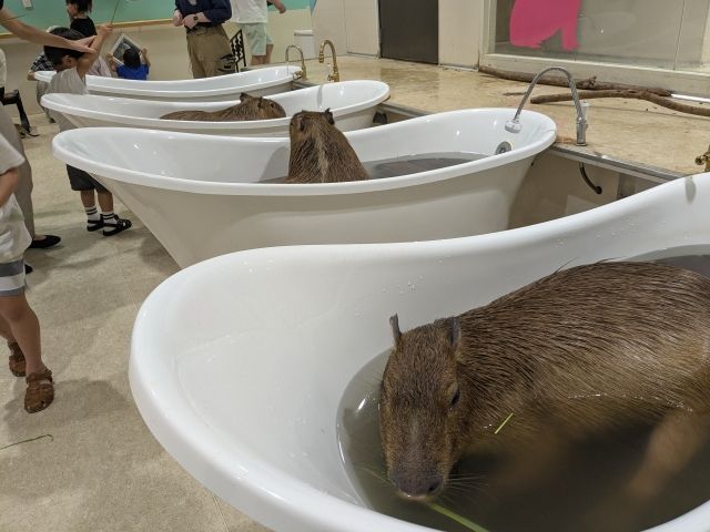 ずらりと並ぶラグジュアリーなバスタブ。その中にはカピバラが一匹ずつ入っています。寝ているのかなと油断していると、突然飛び出してきてびっくりさせられます。