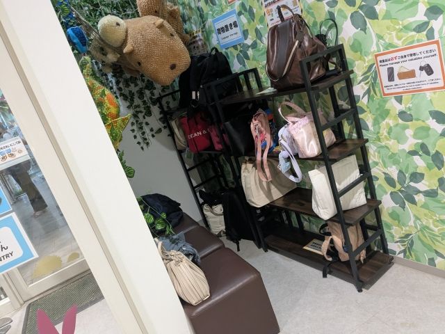 入るとはじっこに荷物置き場があります。ロッカーではないため貴重品は要注意ですが、荷物を置いて手ぶらで楽しむ事が可能です。