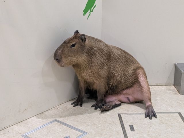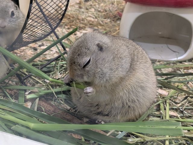 こちらはリチャードソンジリス。ジリスというのは、地上で生活するタイプのリスのなかまで、マーモットやプレーリードッグも属しています。このリチャードソンジリス、座るとびっくりするくらいぽっちゃりで、ほぼ球体です。通常はふれあいNGですが、イベント時にはさわれる場合もあります。