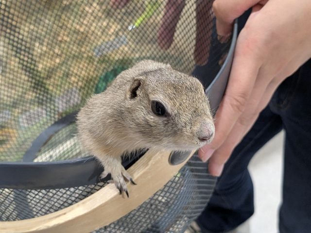しばらくすると、先ほどぽっちゃりしていたリチャードソンジリスのふれあいタイム。カゴに入ったジリスを無料でさわることができます。動きが素早く、写真撮るのに苦戦していると、お姉さんががんばってこちらに向けてくれました。