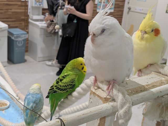 カラフルなセキセイインコやオカメインコ。上手く手懐けると、手のひらや肩に乗ってきてくれます。