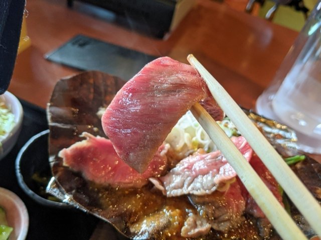 うーん、このつやつやな牛肉が食欲をそそります。せっかくの飛騨牛なのでちょっとレアな焼き加減でいただきます!