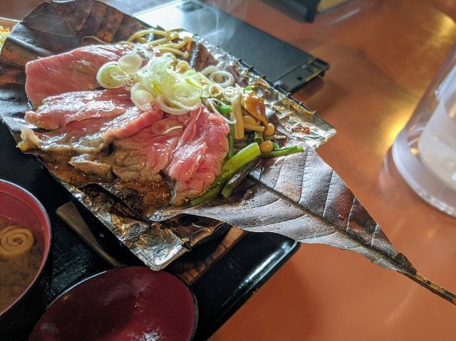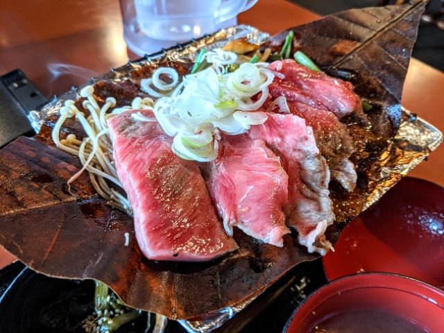 もう一つの名物が、飛騨牛朴葉(ほおば)みそ。飛騨牛のロースを味噌で焼くというメニューで、お値段は定食が2,350円(税込)と鉄板焼よりもワンランク上です。