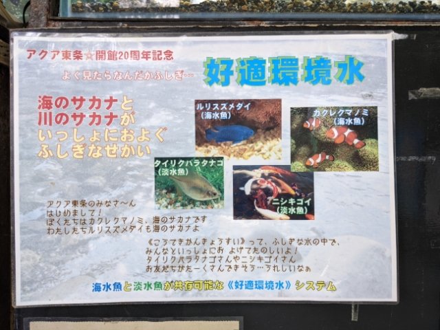 これを使用すると、海水魚も淡水魚も同じ水で飼育することができるのです。貼られている紙にはルリスズメダイ(海水魚)、クマノミ(海水魚)、ニシキゴイ(淡水魚)、タイリクバラタナゴ(淡水魚)が共存と書かれています。