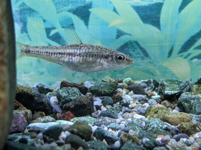 シルバーに輝くイトモロコ。小さいサカナですが、コイの仲間。口もとをよくみるとヒゲが生えています。岐阜・愛知・三重にまたがる濃尾平野以西に生息しているため、関東では見ることができません。