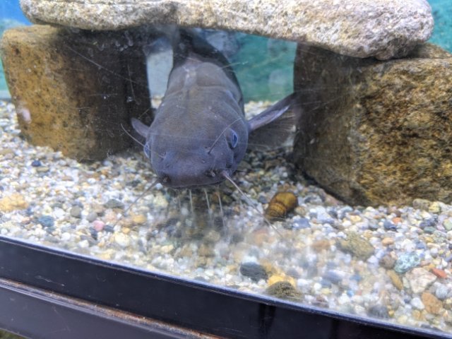 真っ黒いハゲギギ。ナマズそっくりですが、ヒゲの数は8本と倍の数が生えています。背中や胸ビレにトゲがあり、さらに体をつかもうとするとヒレを振動させて「ギギッ」と大きな音を立てるという、高い防御スキルを持っています。
