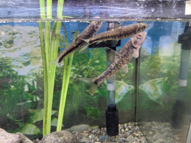 すいすいと泳ぐカワヒガイ。西日本に暮らす小型のコイの仲間です。黒い一本線の模様と黄色いヒレが特徴的ですが、成長するとオスは婚姻色に染まり、目やエラが赤く染まるそうです。ヒガイは漢字にすると「鰉」と書きます。かつて明治天皇が滋賀県で昼食に献上されたヒガイを気に入ったというエピソードからサカナへんに「皇」の字が当てられたそう。そんなに美味しいのでしょうか・・・?