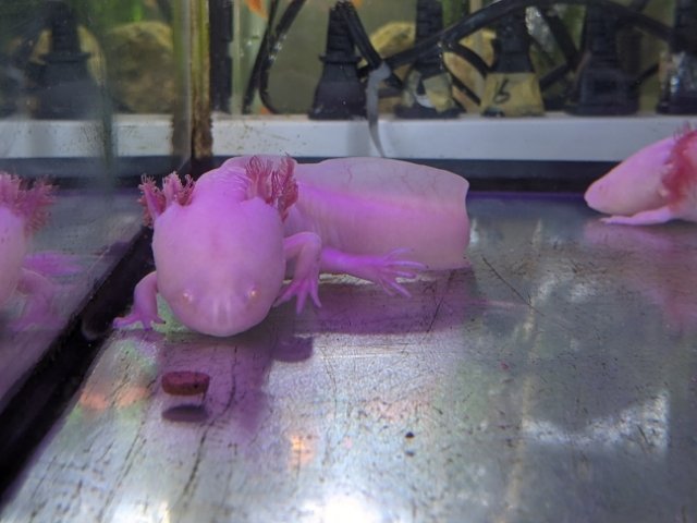 淡水魚の他にもイシガメやスッポンなど爬虫類や両生類も飼育されています。そんな中でも目を引くのがウーパールーパー。10匹以上飼育されており、20cmくらいの大型の個体も多く、なかなか見応えあります。