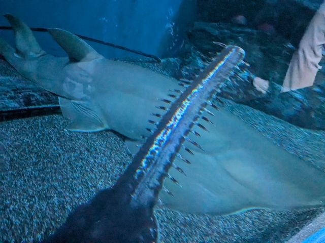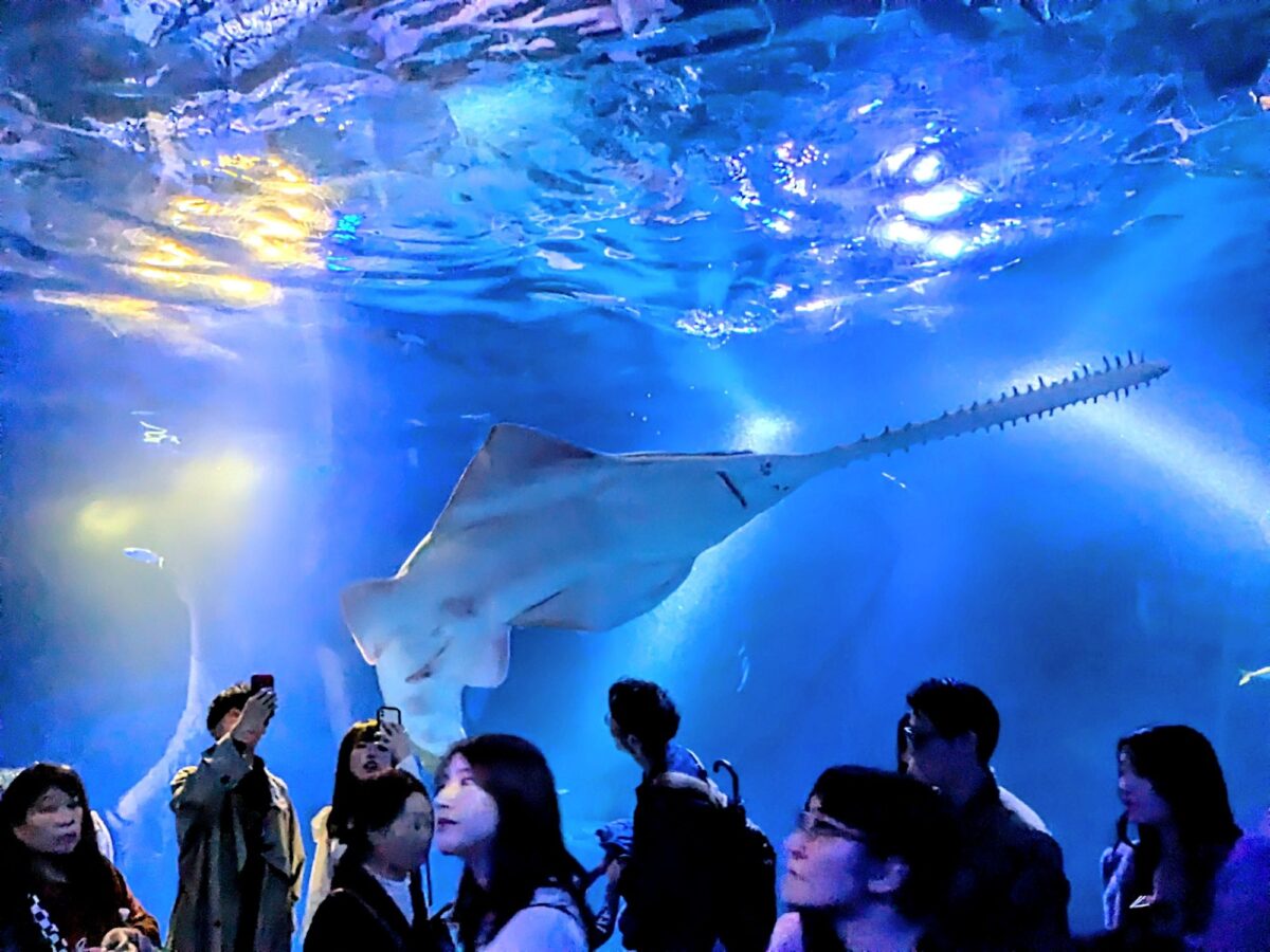 この巨大なノコギリエイはグリーンソーフイッシュ。最大で7mにも達する大型の種です。ここではチューブ水槽ということもあり正確な大きさは判定が難しいのですが、体感では5mはあるように見えました。