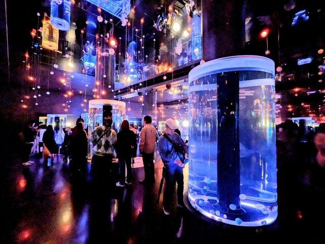 「ジェリーフィッシュランブル」は、ファンタジックなクラゲコーナー。鏡張りの室内には、鮮やかにライトアップされたクラゲがたっぷり。ミズクラゲやタコクラゲに加えて、ギヤマンクラゲやヒトダマクラゲなどちょっとマニアックな種類も。