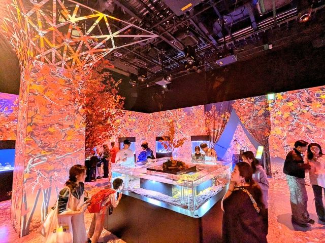 NAKEDプロデュースによるデジタルアートがたくさん。今回は秋の訪問であったため、「MOMIJI AQUARIUM」という紅葉バージョンの演出。モミジが飾られ、床には紅の落ち葉が映し出されます。