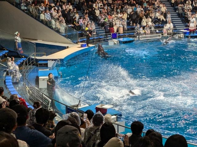 お昼のショー「デイver. 」は、スタッフさんの楽しい進行のもと、定番のバンドウイルカ、スピーディーなカマイルカ、大きなオキゴンドウがパフォーマンスを披露。インデペンデンス・デイの如く天井から降り注ぐウォーターカーテンがここならではの演出です。
