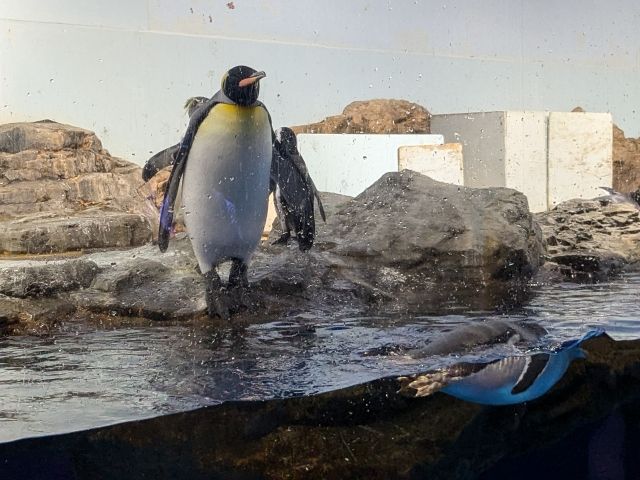 集まる人に謎の圧を放つオウサマペンギン。他にもジェンツーペンギン、イワトビペンギンなど様々なペンギンが一緒に展示されています。