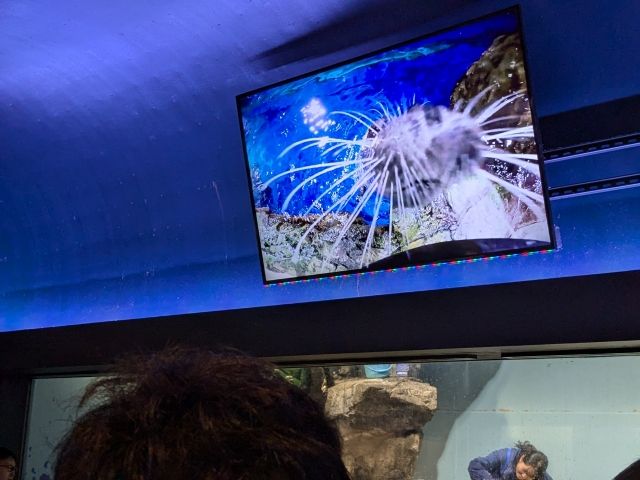 ユニークなのは、飼育員さん目線のカメラが水槽上部のモニターに映し出されること。水槽の様子とモニターの様子、2つの視点で楽しむことができるのです。