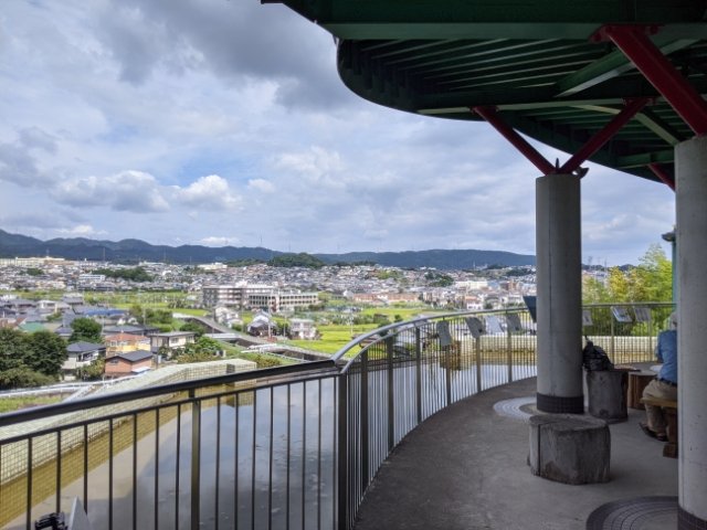 入口のゲートを進むと展望スペースが広がります。テーブルと椅子があり、休憩しているおじいちゃんおばあちゃんがたくさん。ここからは高槻の町並みと、この水族館のメインテーマである芥川や摂津峡、ポンポン山が見渡せます。