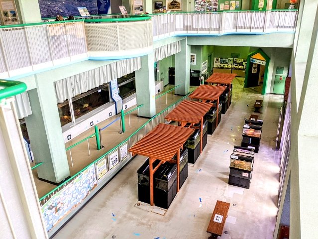 駐車場から向かった場合、屋上が入口。階段を降りていくと、3階、2階、1階へと繋がります。展示室は2階と1階の2フロア。ざっくりですが、2階が水族館、1階が自然博物館、といった内容になっていました。