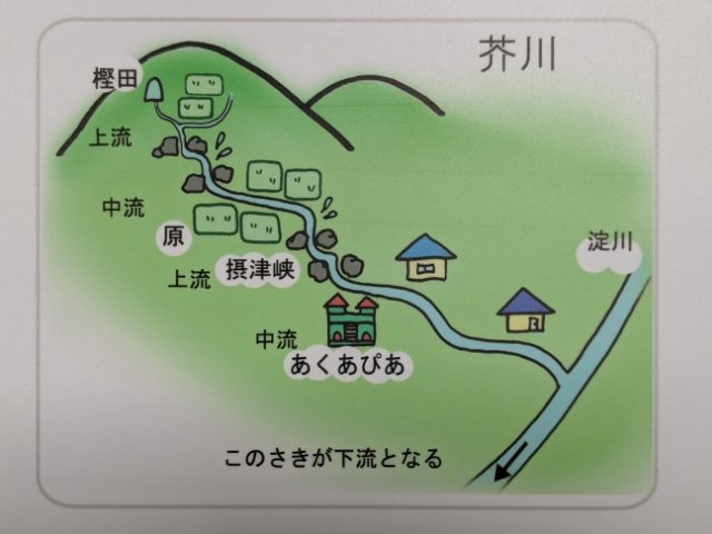 そのため、山間部→盆地→峡谷→市街地と流れる芥川は、上流→中流→上流→中流となるのです。また、その後は淀川という琵琶湖から大阪湾に流れる大きな河川に合流するため、下流は存在しないのです。