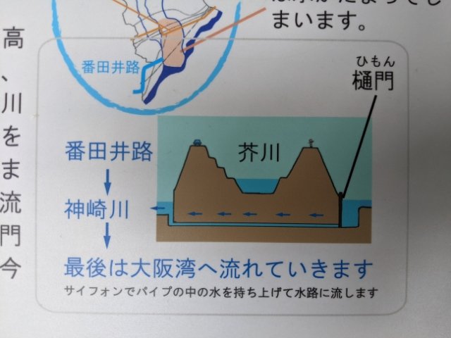 そのため、もし氾濫した場合、その被害は甚大になります。そんな水害対策として考えられたのが「番田井路」。川の下を流れる排水路で、江戸時代の慶安4年(1651年)に高槻藩によって考えられました。(「番田井路」の読み方がわからないのですが、おそらく「ばんだいじ」かと・・・)
