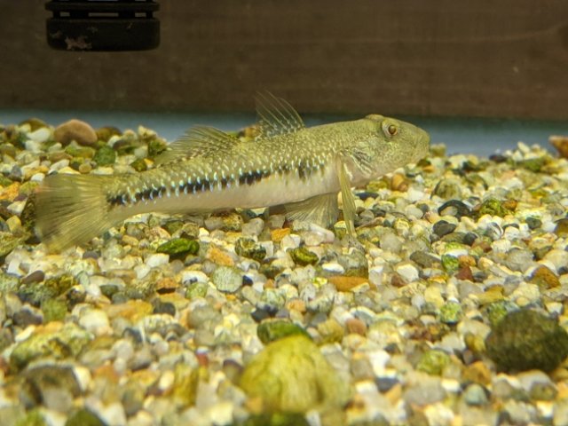 少々面長のルックスのゴクラクハゼ。体に青いドット柄があり、光が当たるとキラキラしてなかなかキレイ。やっぱりですが、近縁種のカワヨシノボリとそっくり。ただし、頭が大きめなことと、眼のすぐ後ろからウロコが生えていることなどで見分けられるそうです。