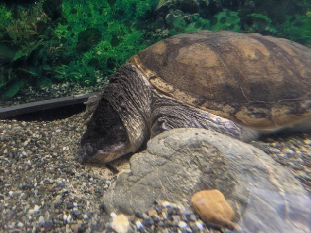巨大なカミツキガメ。名前の通り噛み付いてくる攻撃的なカメ。ペットとして飼われていたものが自然に放たれてしまい、外来種としても有名な種類です。池の水を抜くとよく出てきますね。