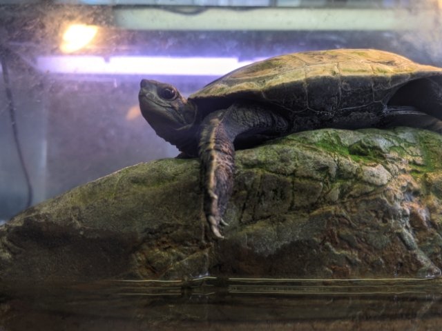 おさかな以外の生き物も飼育されております。中でも目を引くのがカメ!こちらは、つぶらな瞳がかわいらしいニホンイシガメ。名前の通り、日本の固有種。ちなみに「ゼニガメ」はこの種とクサガメの幼体を指していることが多いそうです。