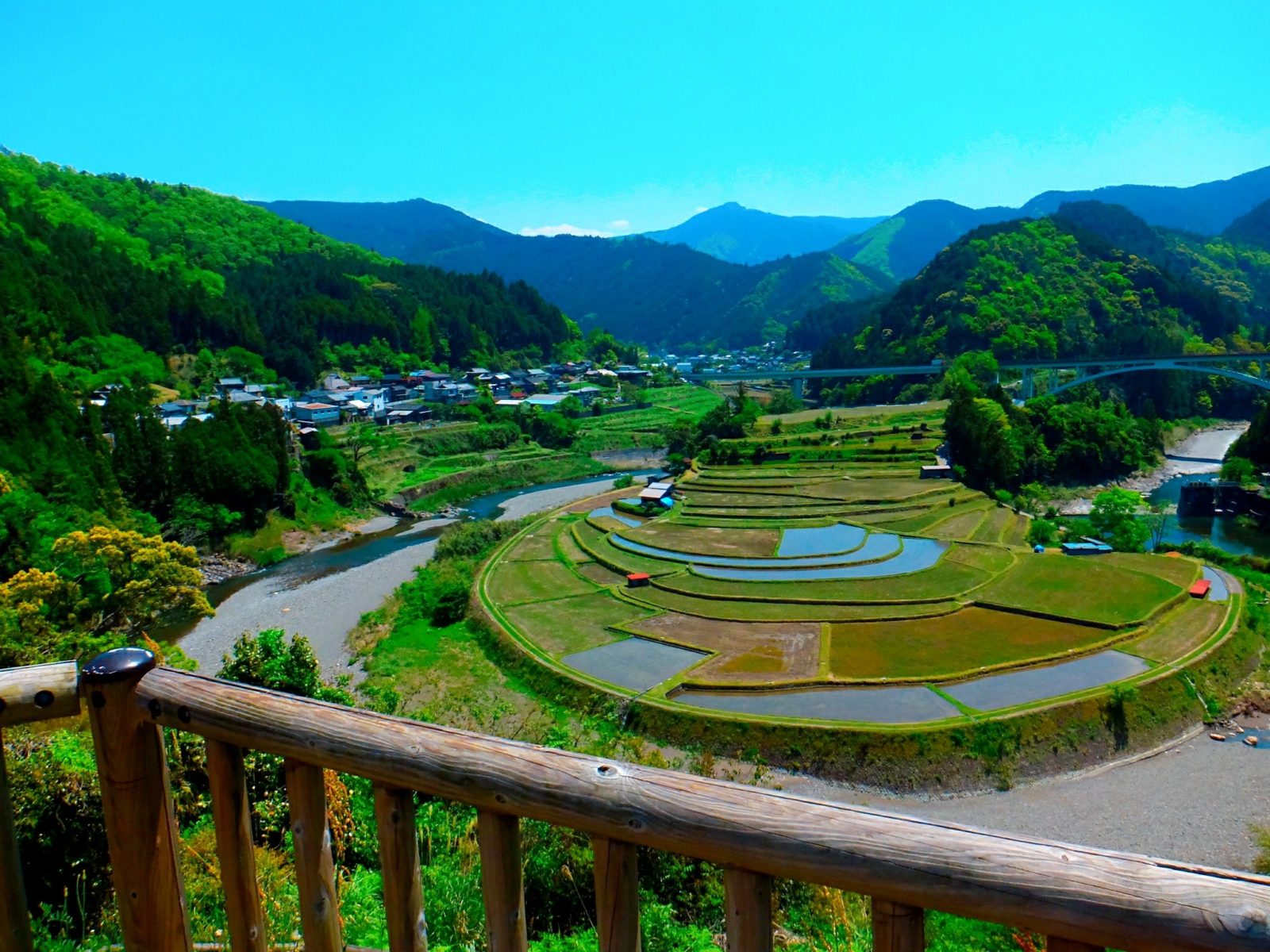 こちらがあらぎ島。漢字で書くと蘭島。島とはつきますが離島ではなく、扇形に広がる不思議な形の棚田。この角度から見ると周囲を川に囲まれているので、島と呼んでも違和感はあまりないです。