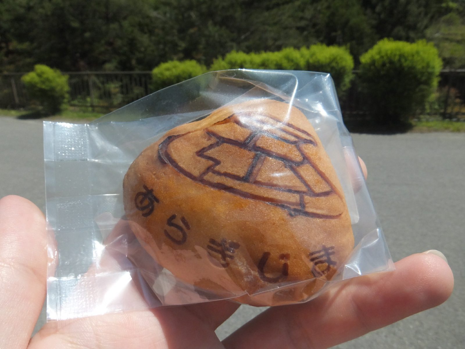 あらぎ島饅頭買っちゃった!あらぎ島を模した扇形のおまんじゅうに、棚田が描かれています。中身はほっくりした黄身あんでとっても美味しい。