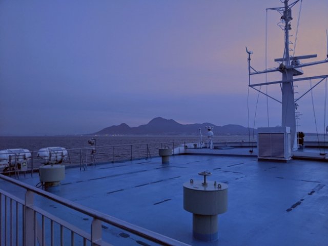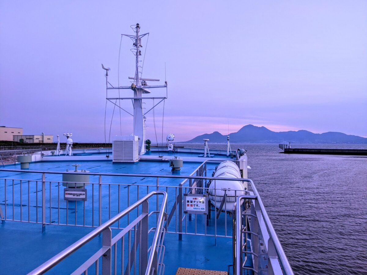 トワイライトの中、目の前に見えてくるのは雲仙岳。巨大な山が徐々に近づいてくる様子は、ずっと眺めていられそう。風は強いですが、ずっと屋外デッキで過ごしました。内海を運航しているため、波が穏やかで揺れが少ないのもポイントです。