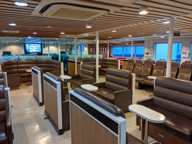 船内はとってもキレイ!屋内席の座席は、おしゃれなファーストフード店、もしくはコーヒーショップみたいな雰囲気のラグジュアリーなシート。わずか45分の乗船とはいえ、リラックスして過ごすことができます。