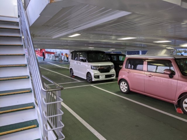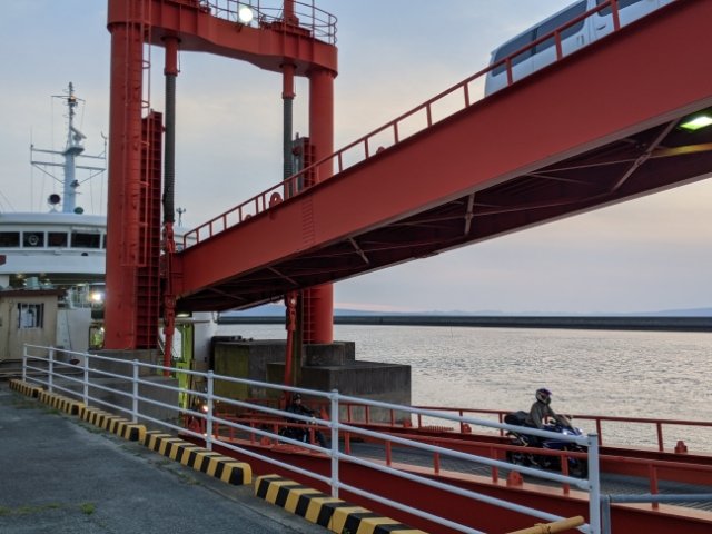 下船が行われるのを近くで見学していたのですが、上と下から次々に車やバイクが放出されていく様子は、戦艦がカタパルトから艦載機を射出しているようでとてもカッコイイです!