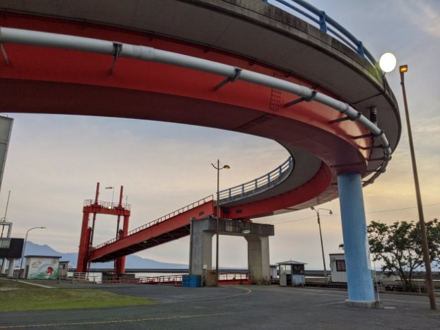 有明フェリーの車両は2フロアに分かれています。下のフロアは地上から、上のフロアはこのカーブ橋でつながっており、2フロア同時に上下船が行われるのです。