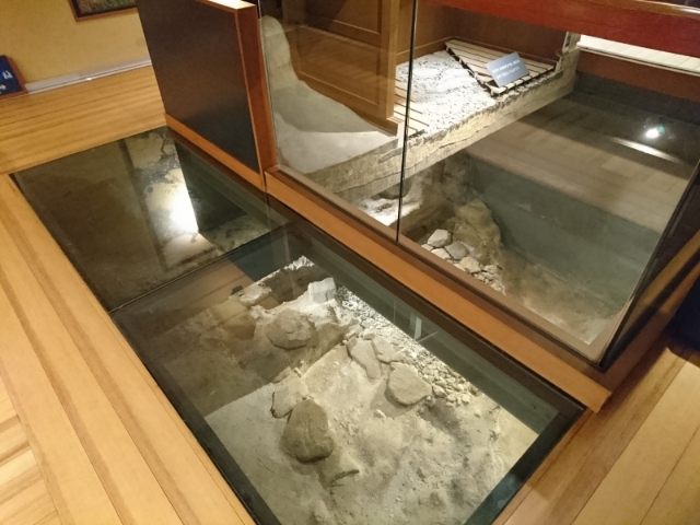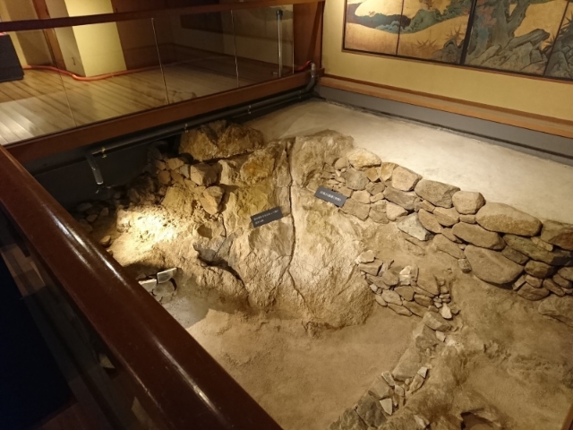豊臣秀吉が入浴したとされる「岩風呂遺構」。出土したままの状態で展示されています。お風呂の遺跡って何だかとても新鮮です。