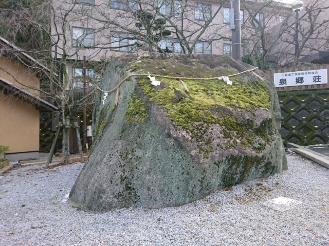 温泉街の入り口に鎮座する袂石(たもといし)。高さ5m、周囲19mの巨石が注連縄で飾られています。