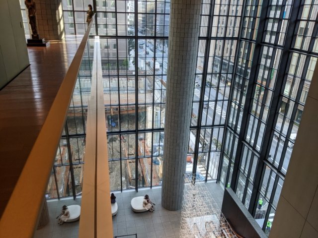 3フロアに渡る吹き抜け部分は、ガラス張りで広々とした空間となっています。ベンチが設置されたビューデッキも設置されており、開放的な気持ちで美術鑑賞を楽しむことができます。