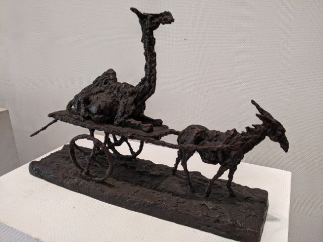 動物をモチーフにした作品も多く見かけます。こちらはラクダを乗せた荷馬車をヤギが引く『サッカラの道』。動物が動物を使役しているような不思議な世界観です。