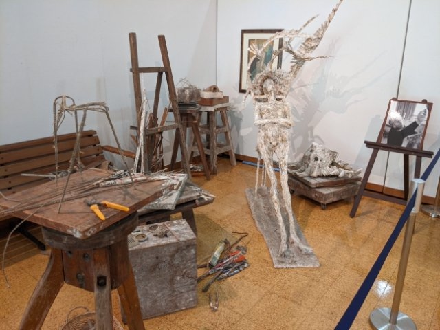 一角には再現されたアトリエも。様々な工具やワイヤーが散らばっており、立体を作り上げていく工程を感じ取ることができます。