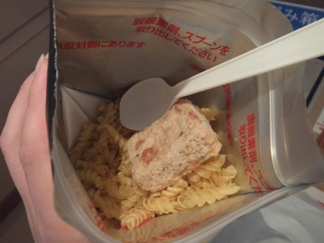 普段はなかなか食べる機会の無い非常食、せっかくなので何か挑戦してみよう!ということでペペロンチーノを買ってみました。中には乾麺のパスタと、卵スープみたいなカタマリが。お湯を入れてよく混ぜ、ジップロック式のフタを閉じて3分ほどでできあがり。なお、熱湯だけでなく水でも調理可能!その場合は20分と少し時間がかかりますが、災害時やアウトドアで非常に重宝しそうです。