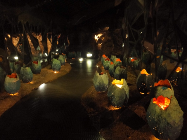 進んで行くと暗い通路の両サイドに卵のような、ピカピカ光る不思議な鉱物が並んでいます。なんだかテーマパークのアトラクションみたいでわくわします!