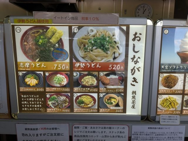 朝熊茶屋では、伊勢うどん、志摩うどん、あおさ汁などご当地感あふれるメニューが。松阪肉コロッケ、天空のソフトクリームなど気軽に食べられるものもあります。