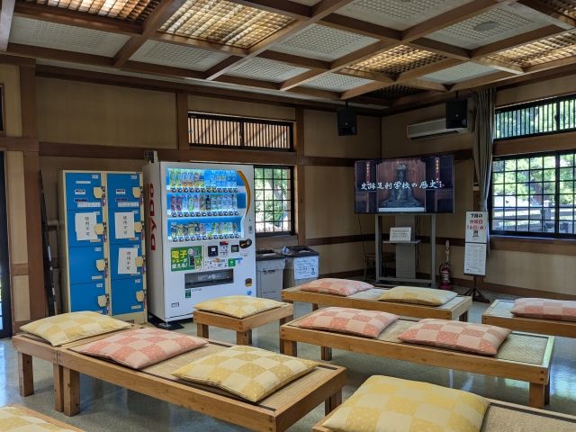 受付のそばには、トイレと自販機を備えた休憩所があります。14分間の案内映像がエンドレスで流れているので、最初に見ておくとその後の見学がより楽しめます。あと、暑い日は貴重なエアコンスポット!