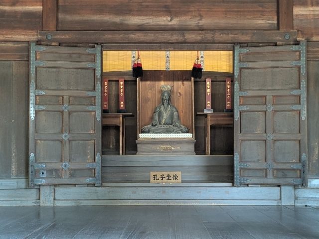孔子廟の中心に安置されているのは孔子像。室町時代の天文4年(1535年)に造られたもので、日本最古の孔子彫像といわれています。ちなみに頭巾を被り儒服をまとった姿を、「行教像」と呼ぶそう。