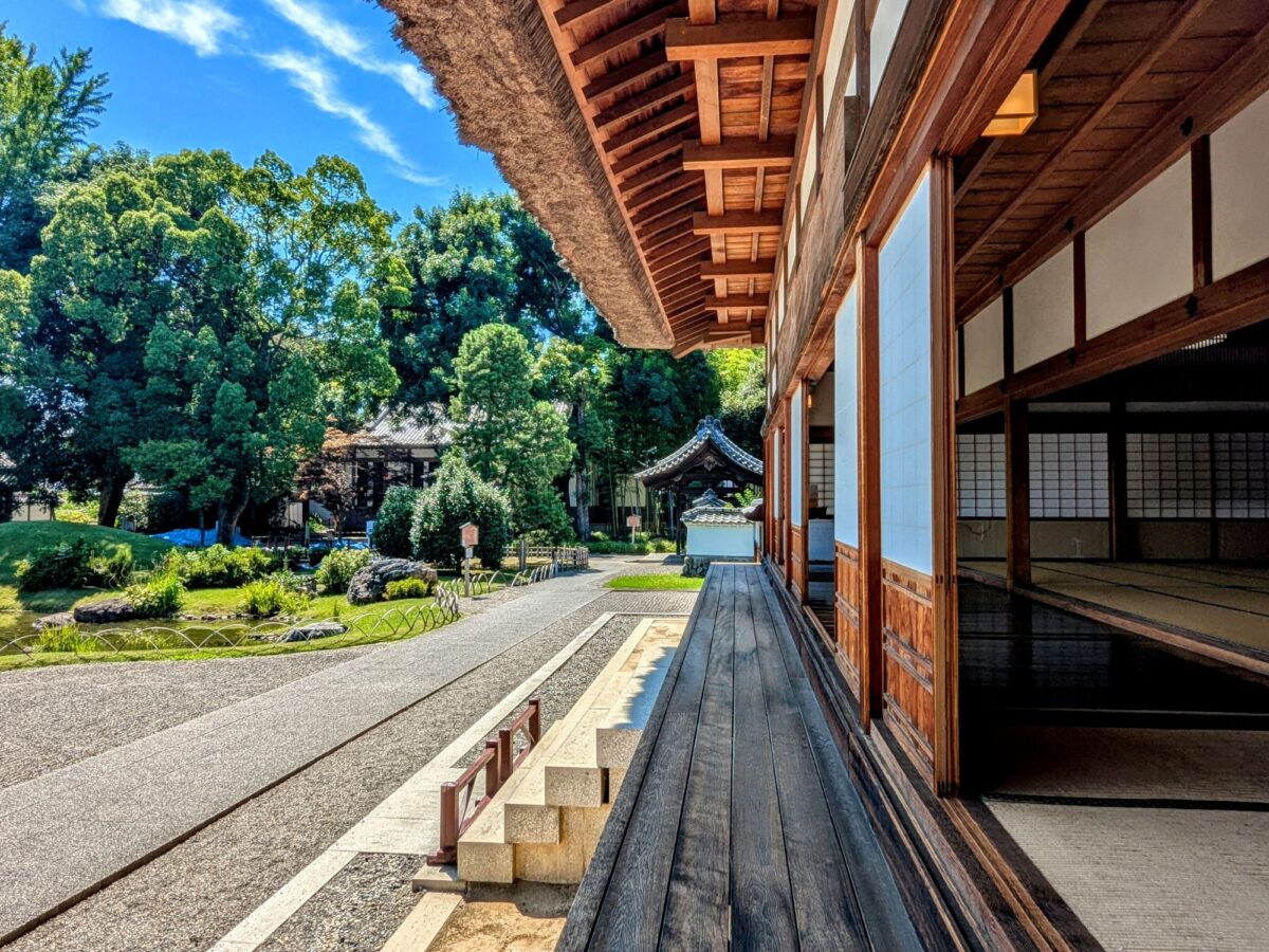 靴を脱いで上がると、広々とした座敷に縁側。目の前には池や築山のある庭園が広がり、吹き抜ける風が心地よい穏やかな空間。