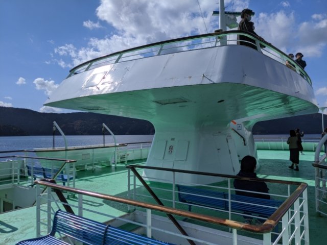 やっぱり海賊船と比べるとどうしても地味な印象がある芦ノ湖遊覧船。せっかく宇宙船っぽいデザインなので、ネオン照明などでスペースシップ風にアップデートしてみてはどうでしょうか?