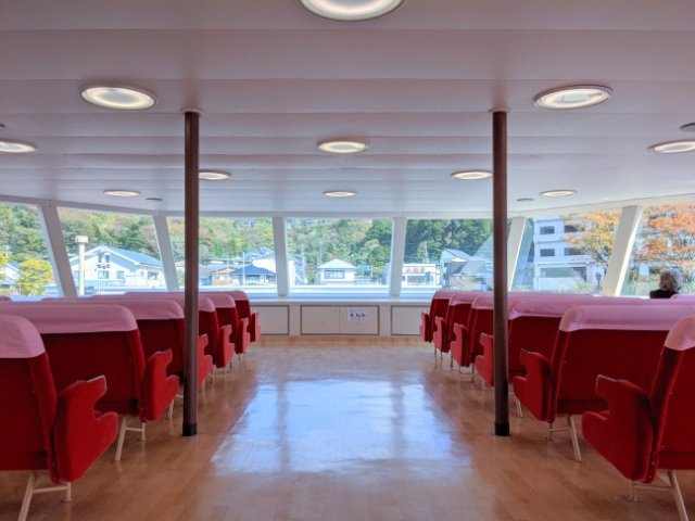 冷暖房が完備された屋内席。船の横幅が広いため、とっても広々としています。余計な装飾の無いシンプルな内装は、非常にさっぱりとした印象です。