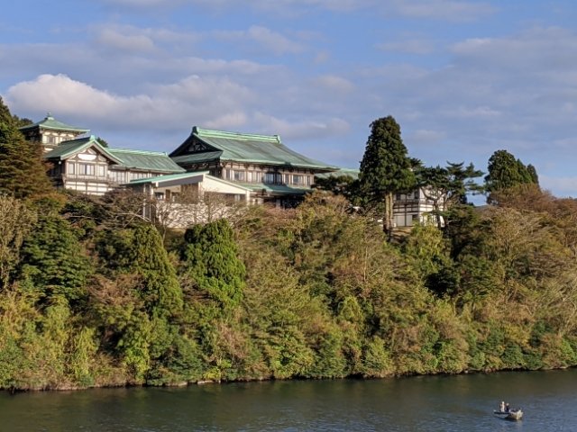 船が進んでいくと見える景色も少しずつ変化していく。箱根園港に差し掛かったあたりで、緑青の屋根が重厚な建築が見えます。まるで寺院のようなこちらは「龍宮殿」。京都の平等院鳳凰堂をモデルにした宿泊施設で、かつて浜名湖にあったものを移築してきました。