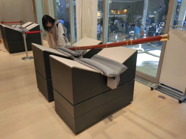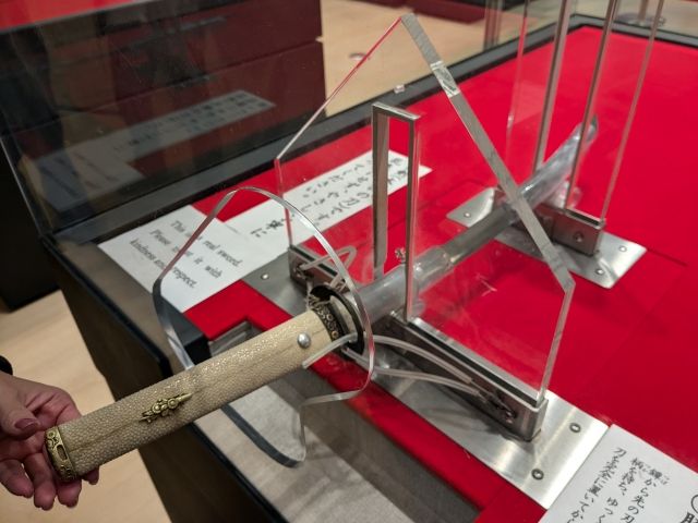 基本的に展示室は写真撮影NG。ただし、一部体験コーナーに限り撮影可となっていました。こちらはホンモノの「脇差」を実際に持つことができるコーナー。全長70cmと短い刀ですが、なかなかの重さ。